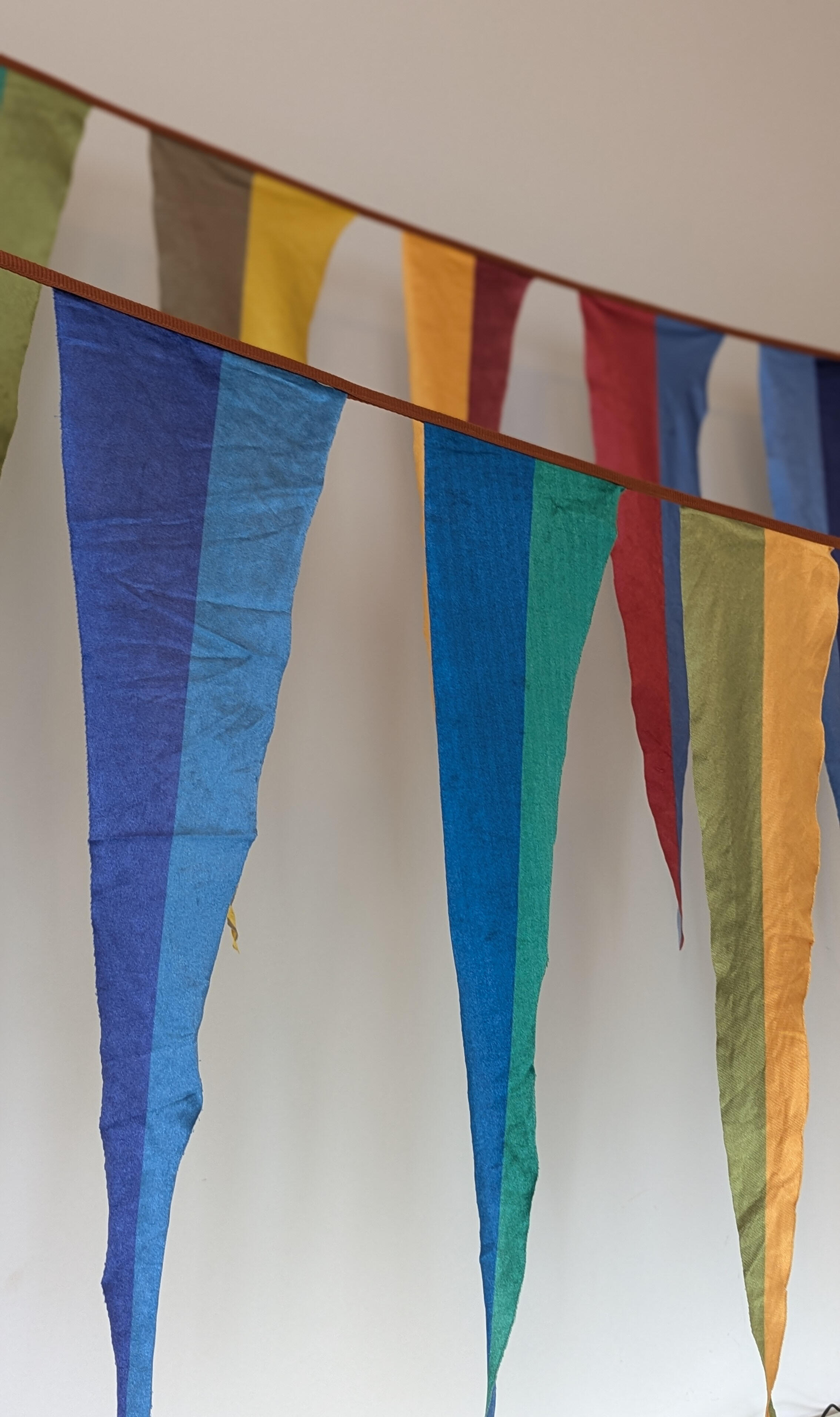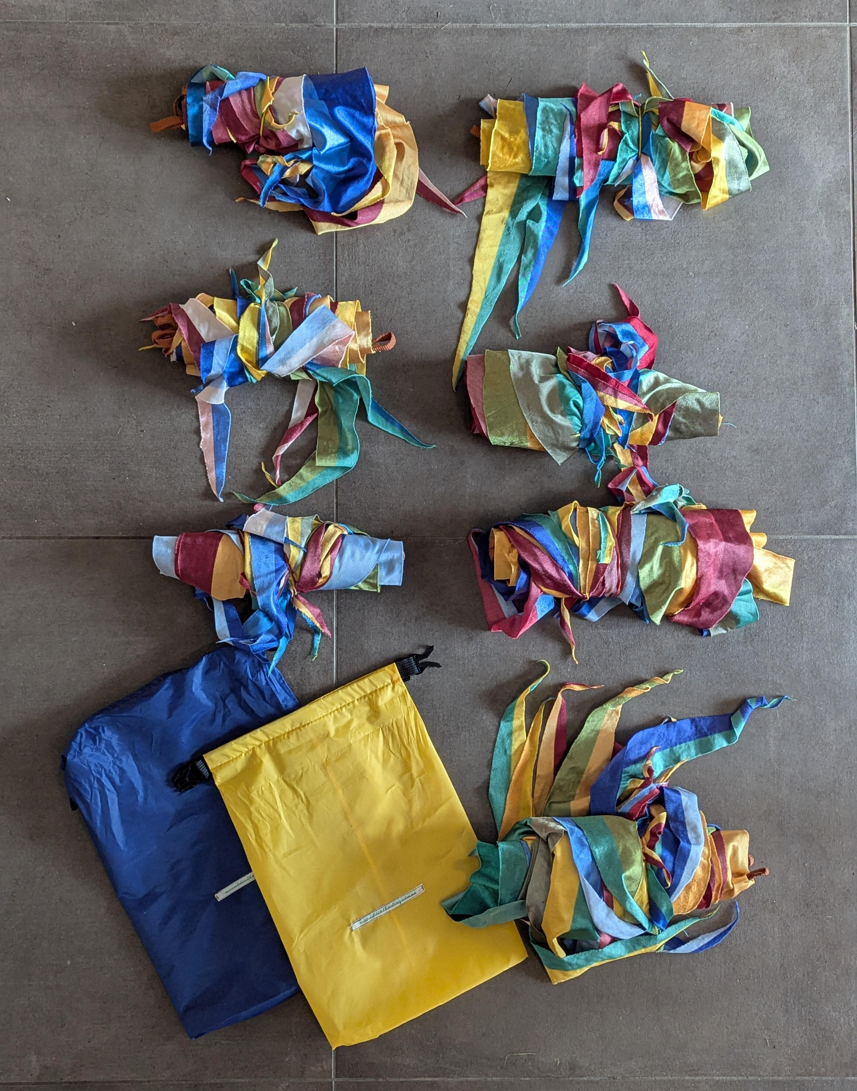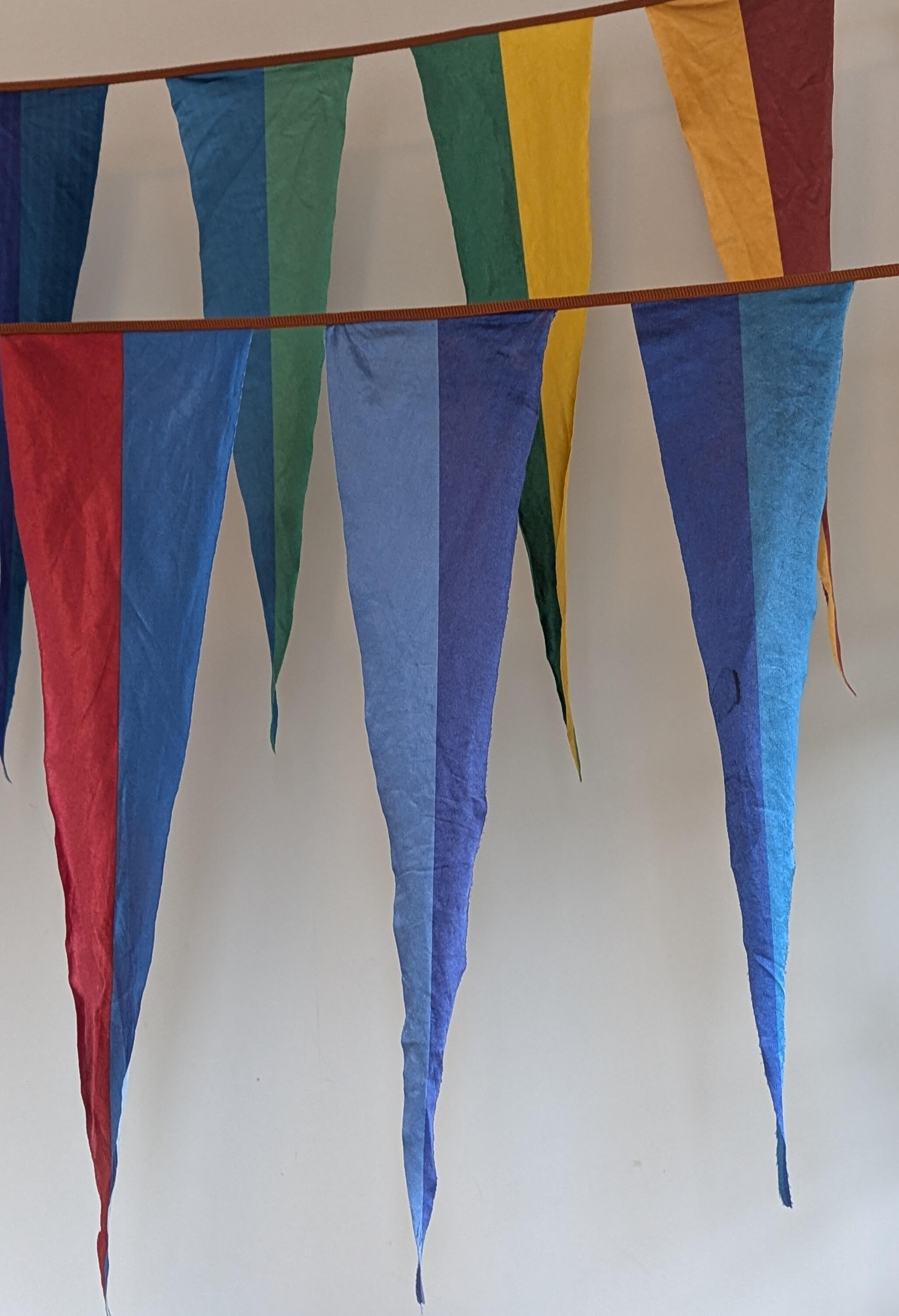 Long, slender flags in two-tone pairings, arranged in a shifting rainbow arc. Light, responsive, and the most breeze-loving of the bunch.
